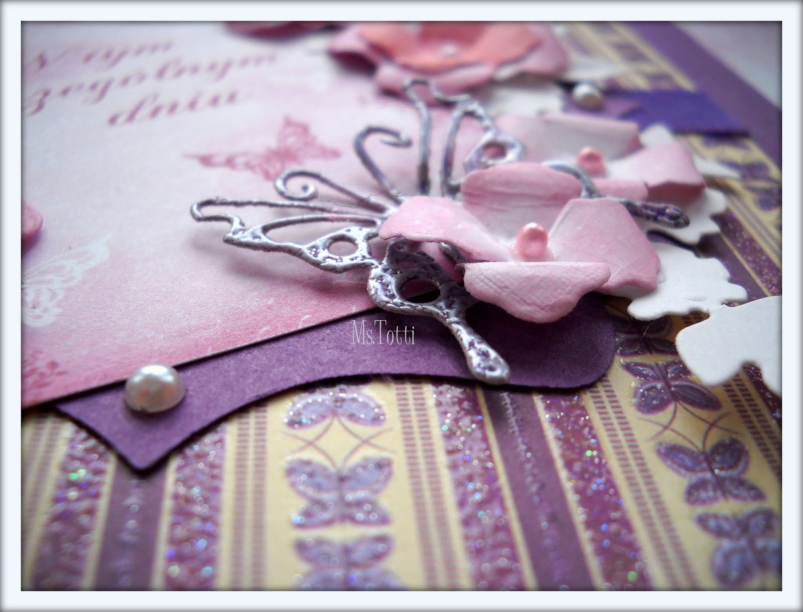 Kupiłam kiedyś zestaw papierów Dovecraft, który chciałam wykorzystać do zrobienia mini albumu. Albumu nie powstał, a papier przeleżał się kilka miesięcy aż do dziś. Tag pochodzi od Asica Scrap z kolekcji Pastelowa Rapsodia. Kwiatki z wykrojników Joy - różowe tuszowane moimi rączkami:)