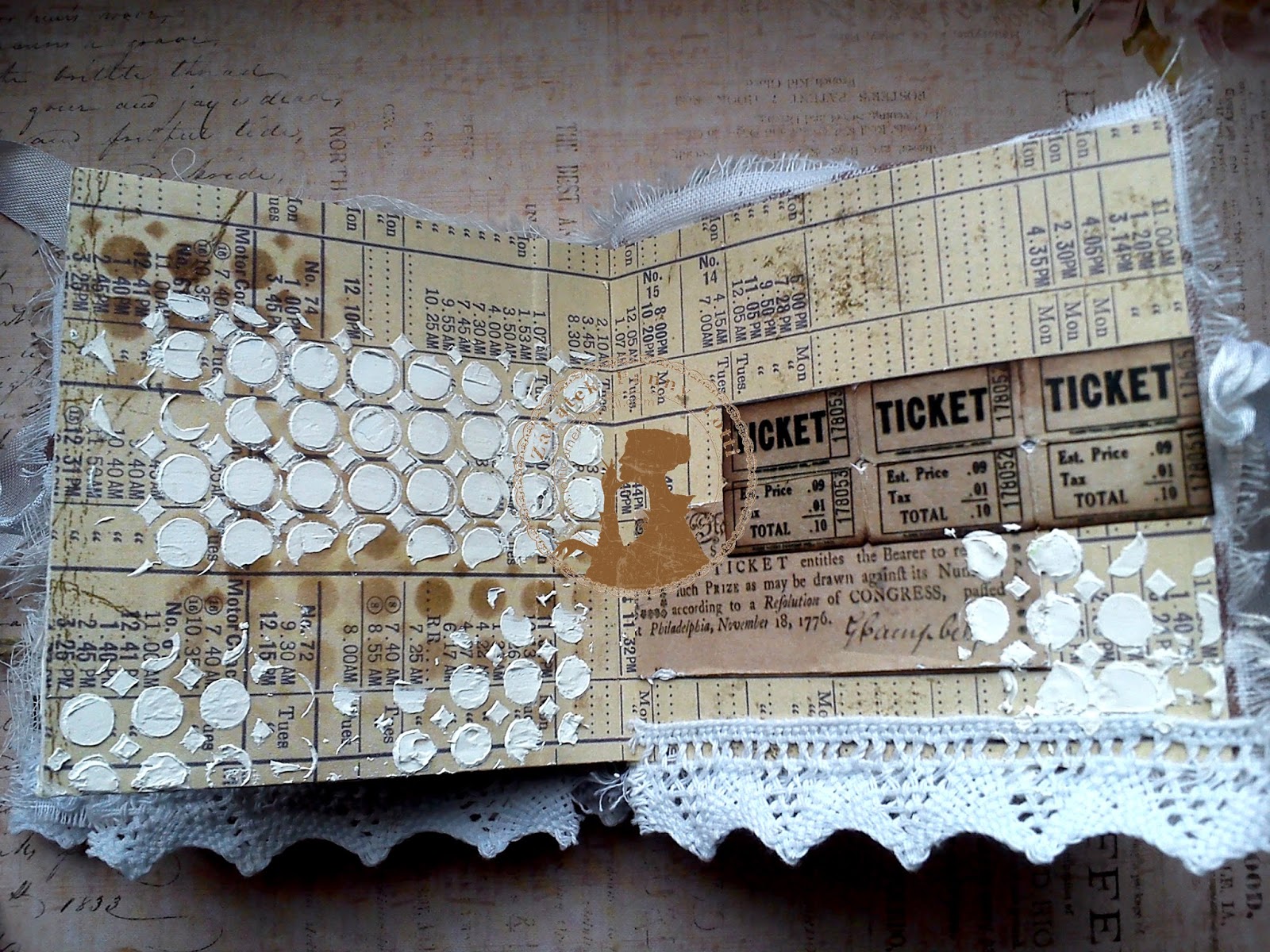 Album powstał z tektury, bawełnianego materiału, koronek bawełnianych, gazy, Ayeeda Gesso, Ayeeda Mist i mojej turkusowej, stempli 3rd Eye, papierów tego, tego i tego.